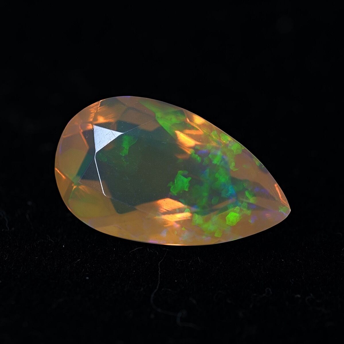 ミルキーなオレンジを地色のベースカラーとして、青と緑のピーコックカラーが際立つ個体です。特に上部はピンファイアのような細かな遊色、下部は大きめのフラッシュパターンと、一石で2石分楽しめる子です。
