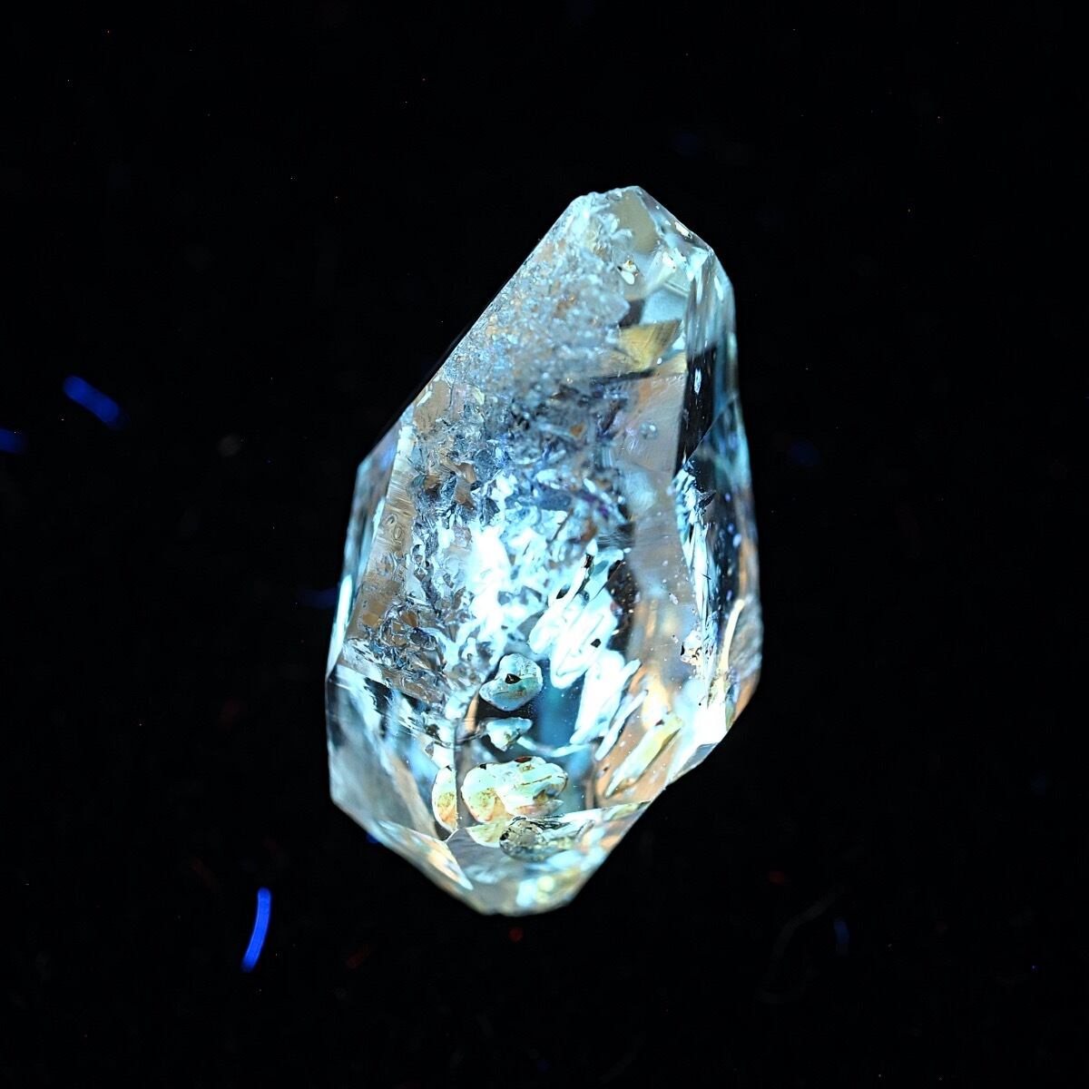 オイルインクォーツの最大の特徴ともいえるのが、ブラックライトを当てることで美しく蛍光するオイル。透明な水晶の中で、点在する石油がネオンブルーに光る様子は本当に幻想的です。