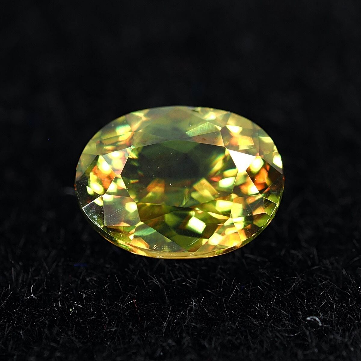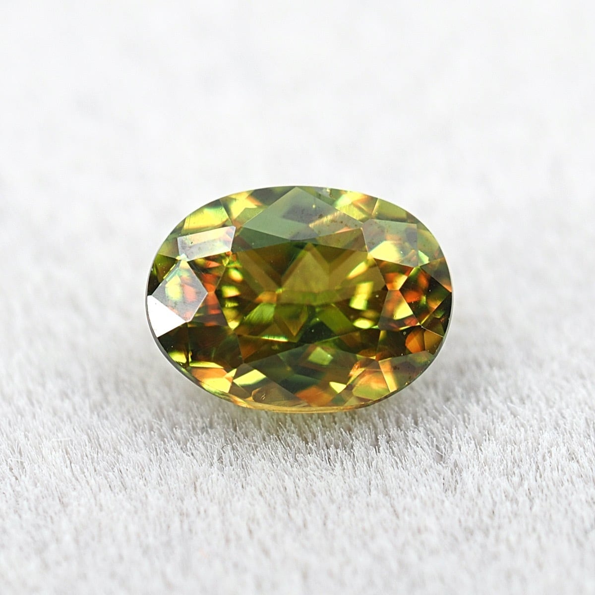 光をスペクトル色にする特徴があり、グリーンの宝石ながら、赤、橙、黄、明るいグリーンと様々な色の輝きを見せます。これはダイヤモンドも持つ「ファイア」という特性なのですが、その屈折率はダイヤモンドをも凌ぎます。