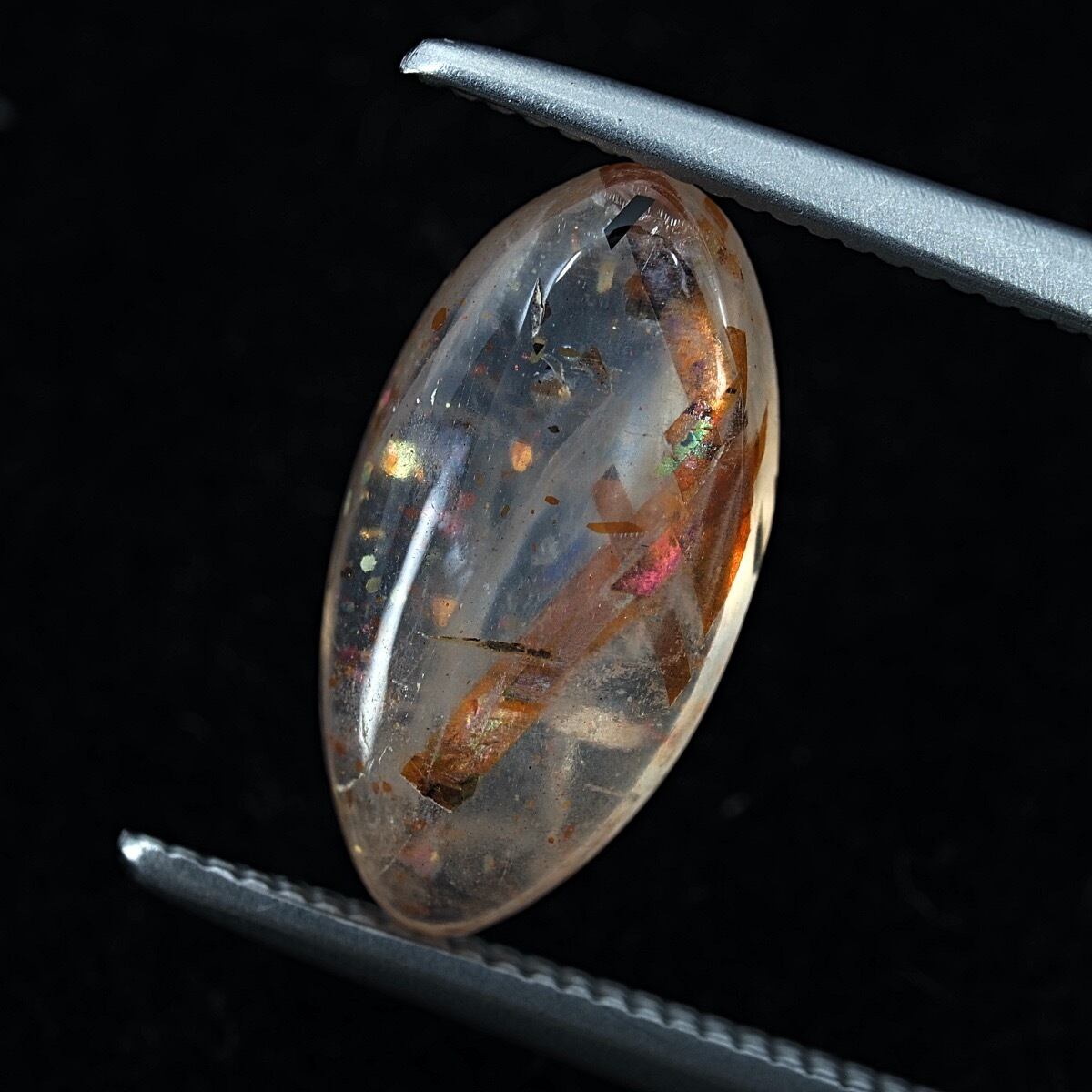 正長石で赤鉄鉱とチタン鉄鉱を内包しています。格子状の内包がレインボーの名の通り虹色の煌めきを見せる個体です。