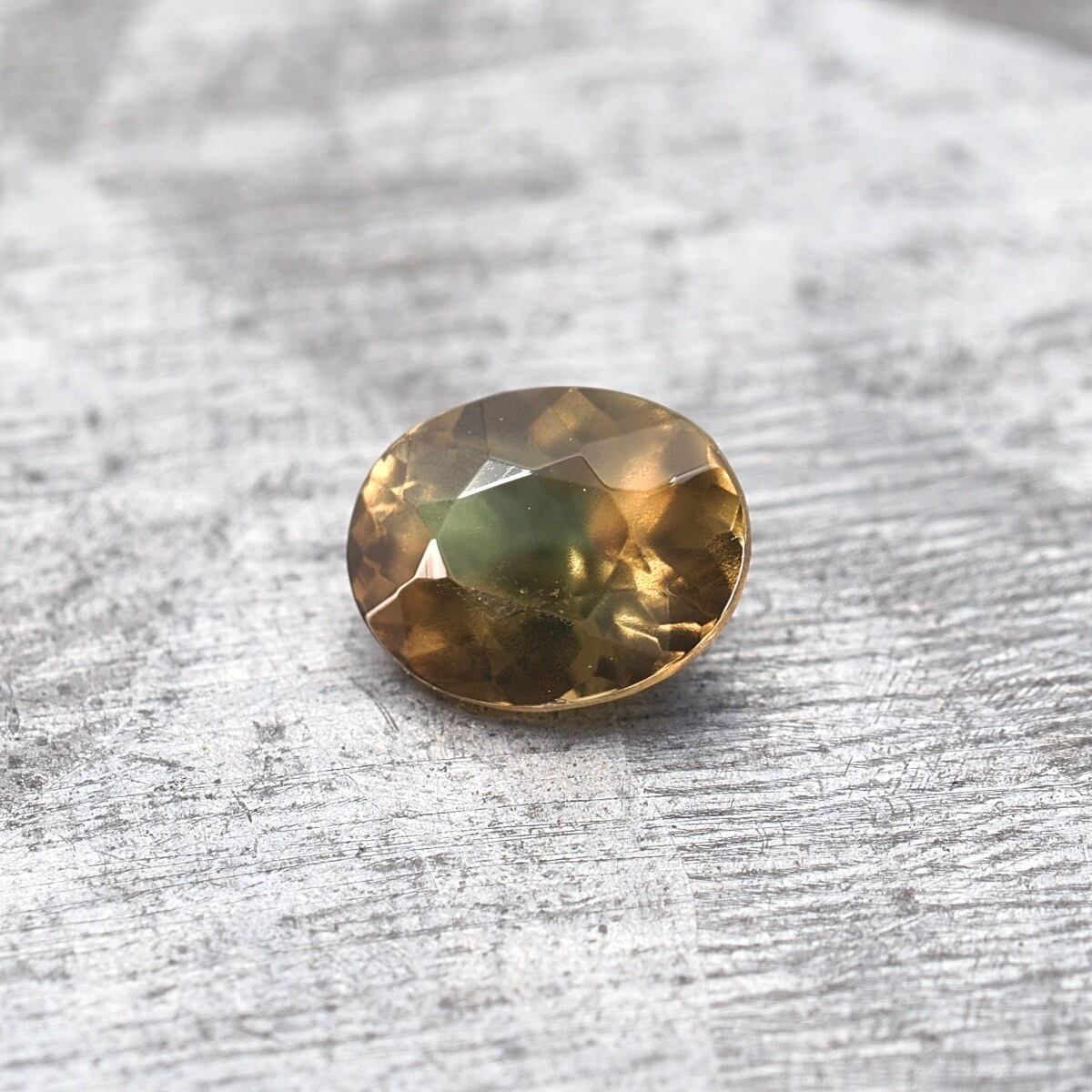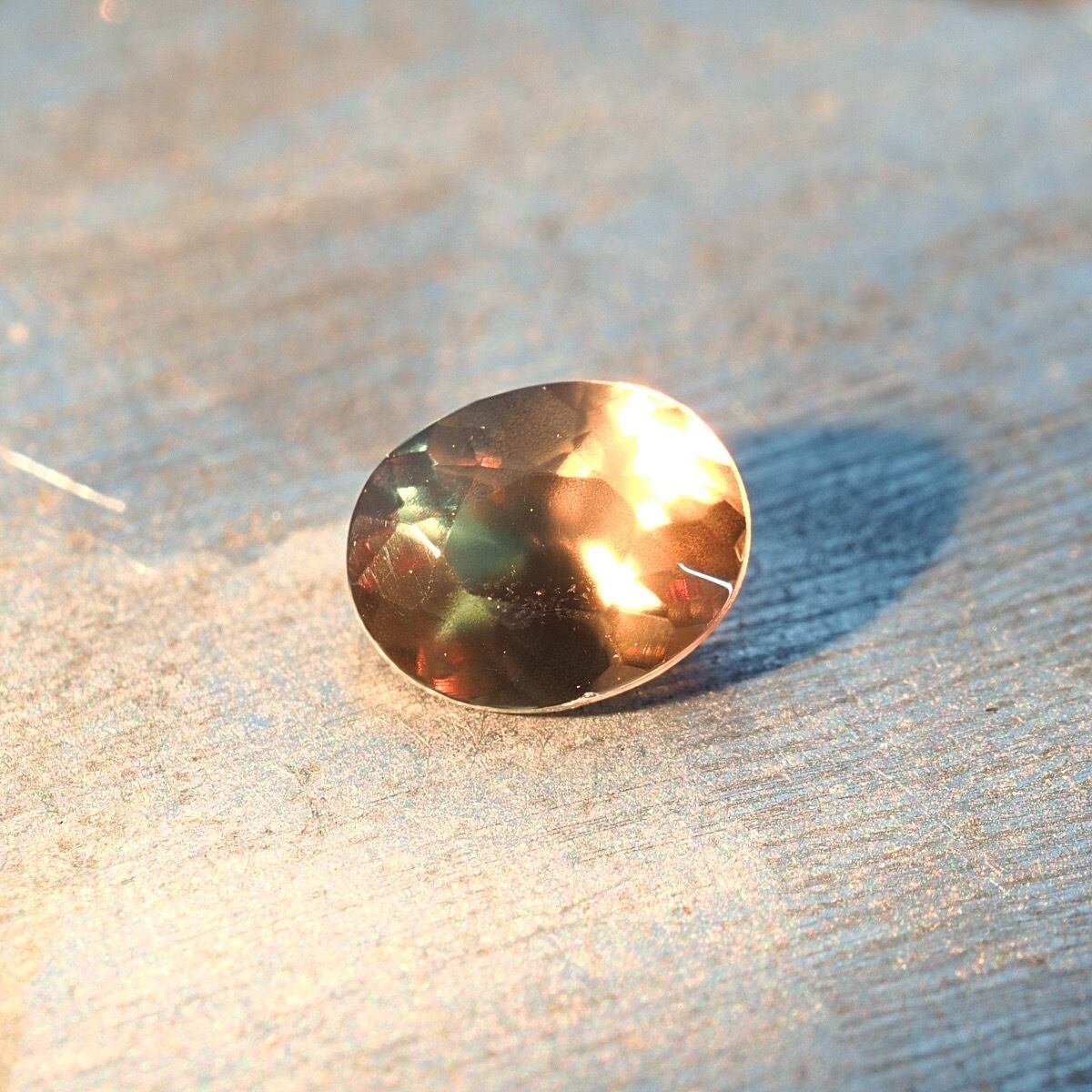 ギリシャ語で3種を意味する“tria”と部族を意味する“phylon”に由来する希少石、こちらはカラーチェンジする個体です。白熱チェンジでライトオレンジブラウンへの変化。