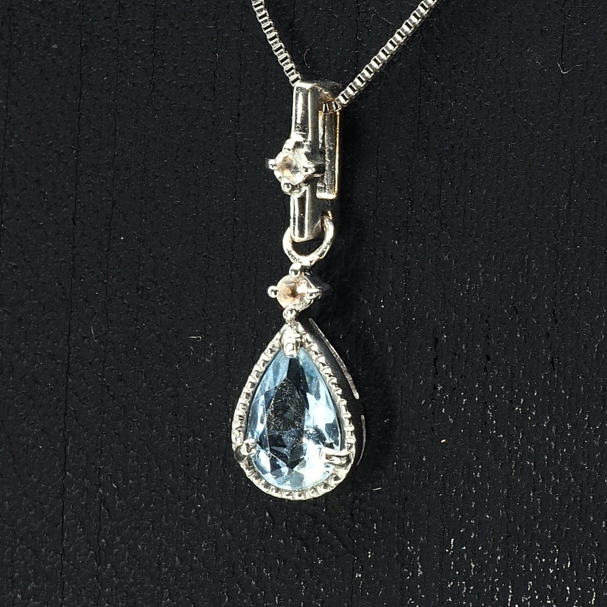 一般的に流通しているアクアマリンの定番色よりほんの少しシックな青みを持つペアシェイプカットがセットされています。