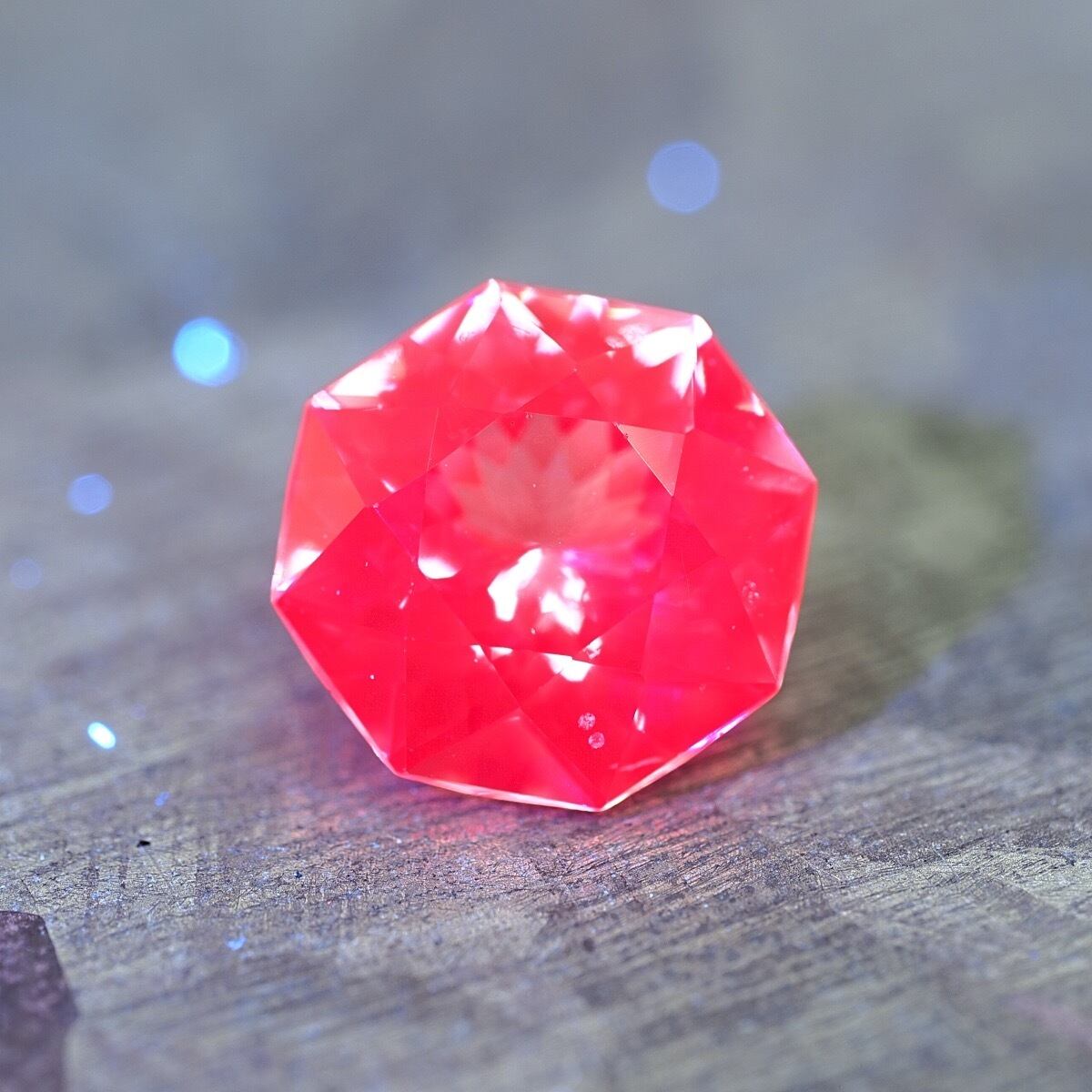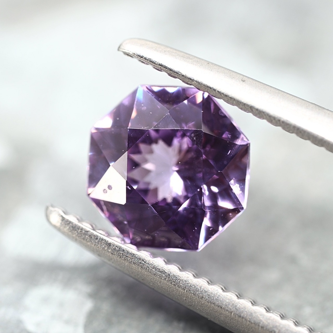 地色は落ち着いた大人の紫でありながら、光源が当たった時の煌めきが非常に美しいです。蛍光も強め。動画でも観れますがこの輝きにベストマッチするかのようなオクタゴンシェイプ、これはコランダムでは意外と珍しい多角カットではないでしょうか。