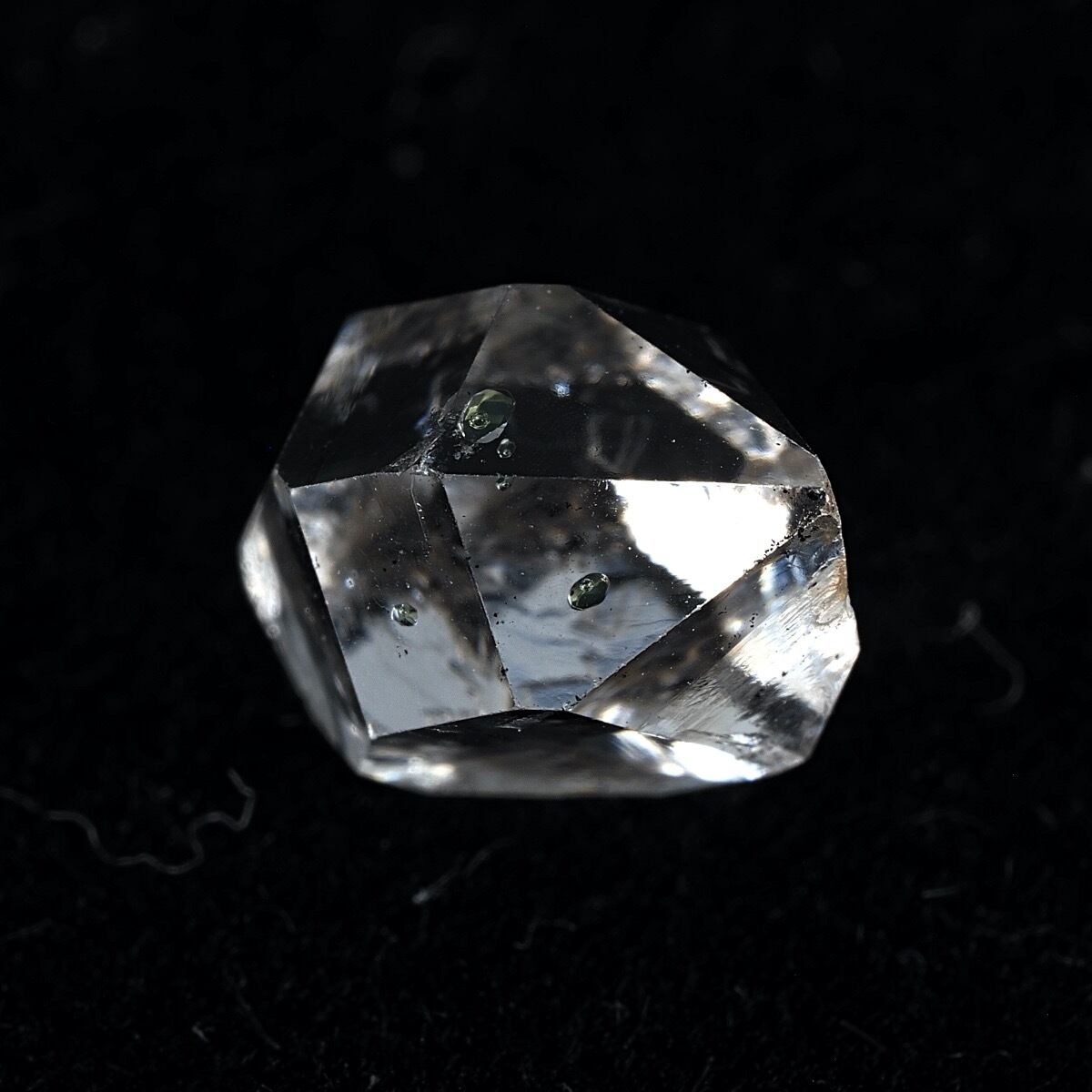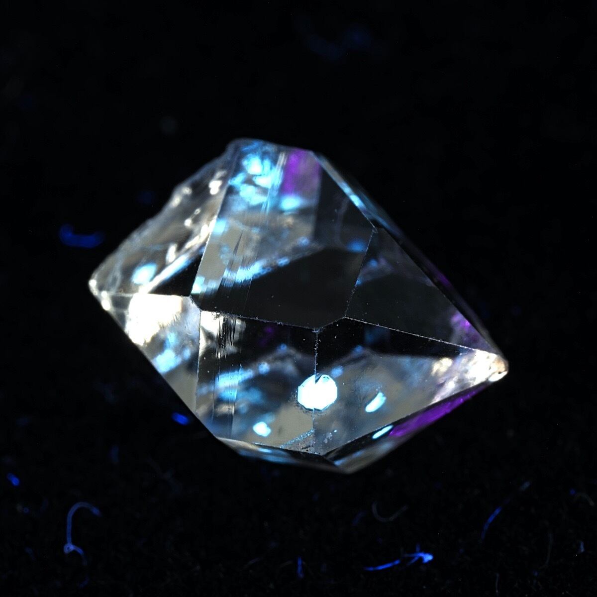 オイルインクォーツの最大の特徴ともいえるのが、ブラックライトを当てることで美しく蛍光するオイル。透明な水晶の中で、点在する石油がネオンブルーに光る様子は本当に幻想的です。