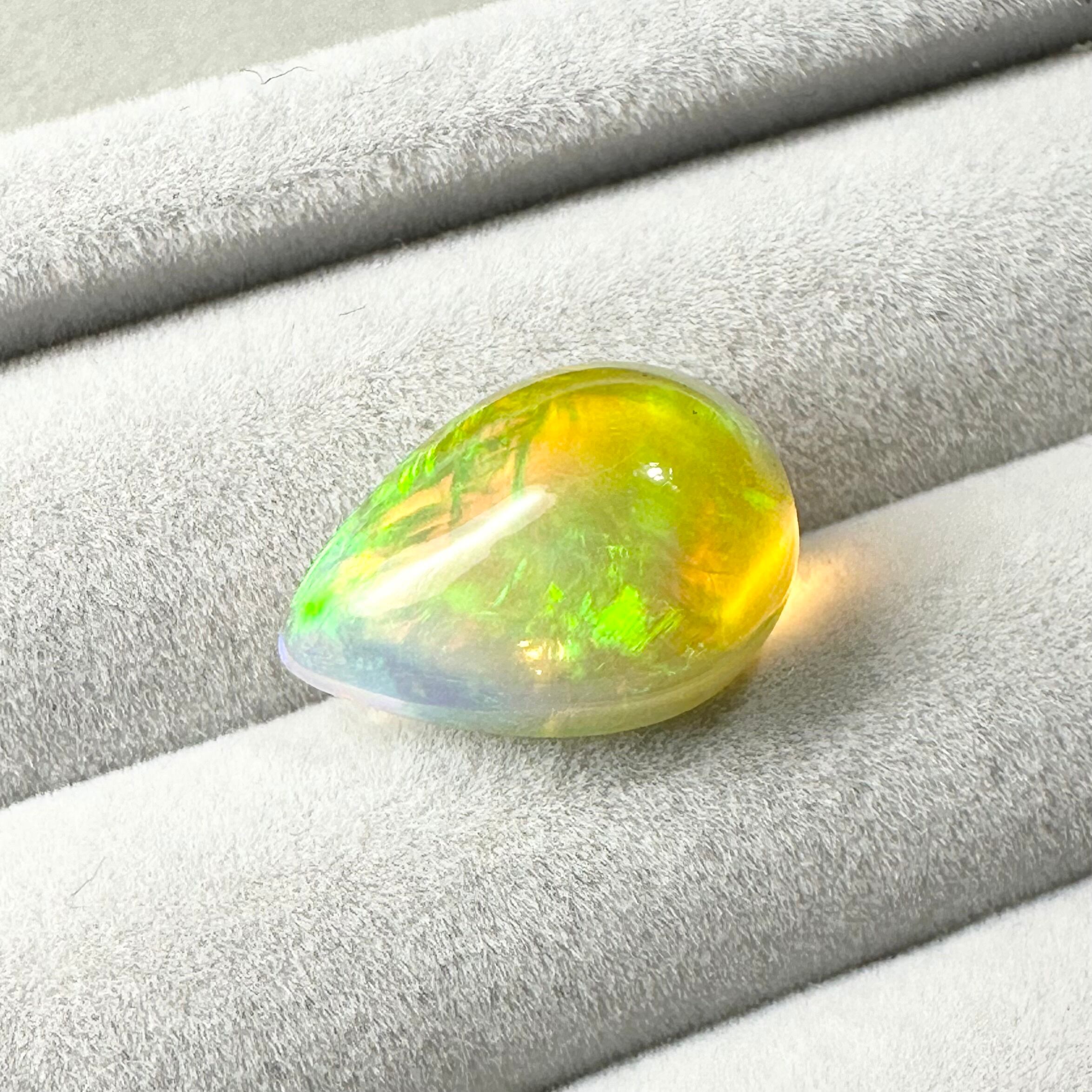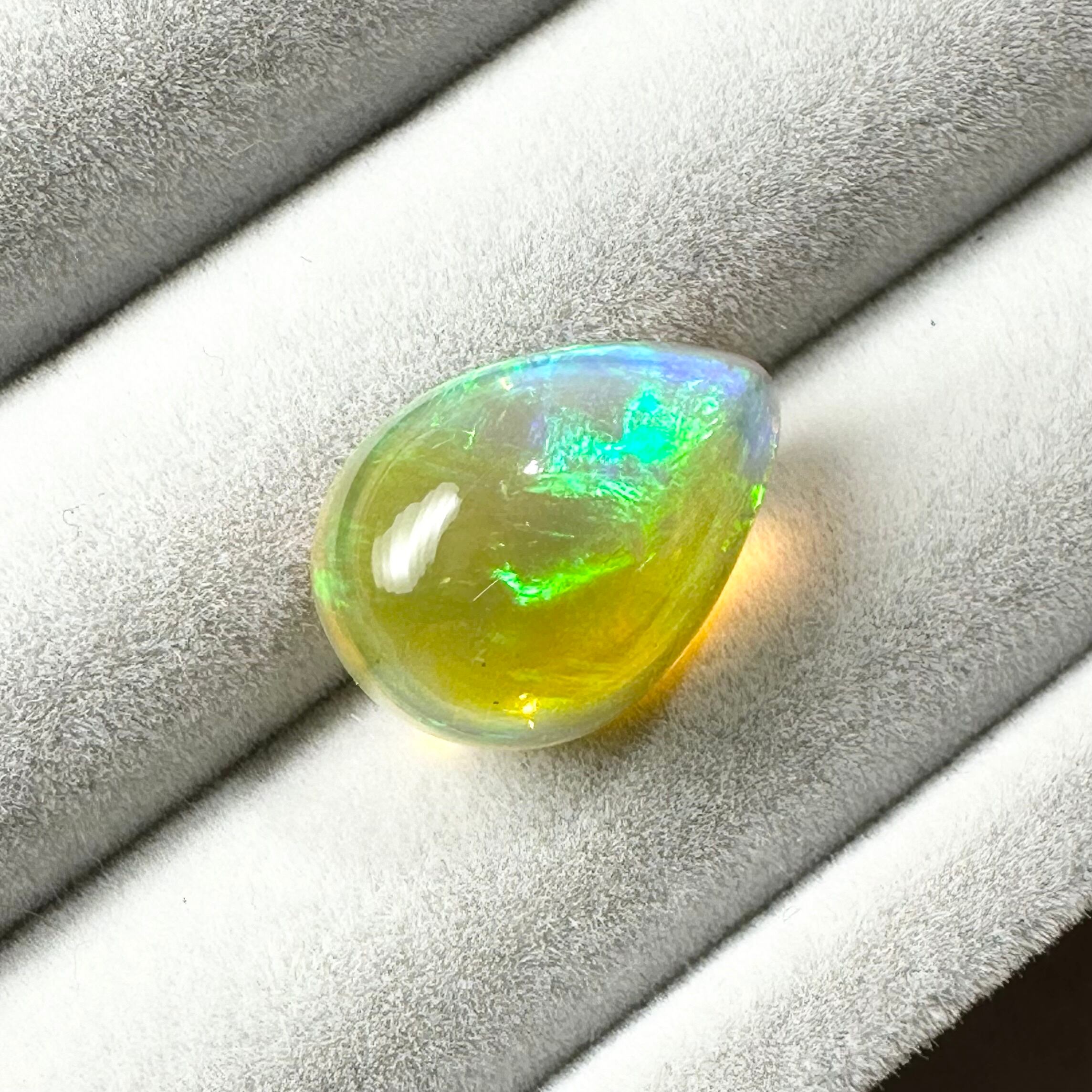 クリスタルオパールのホワイトクリアと、ファイアオパールのイエローオレンジの色合いを両方兼ね備えた面白いオパールです。遊色は広範囲のフラッシュパターンで非常に美しいです。