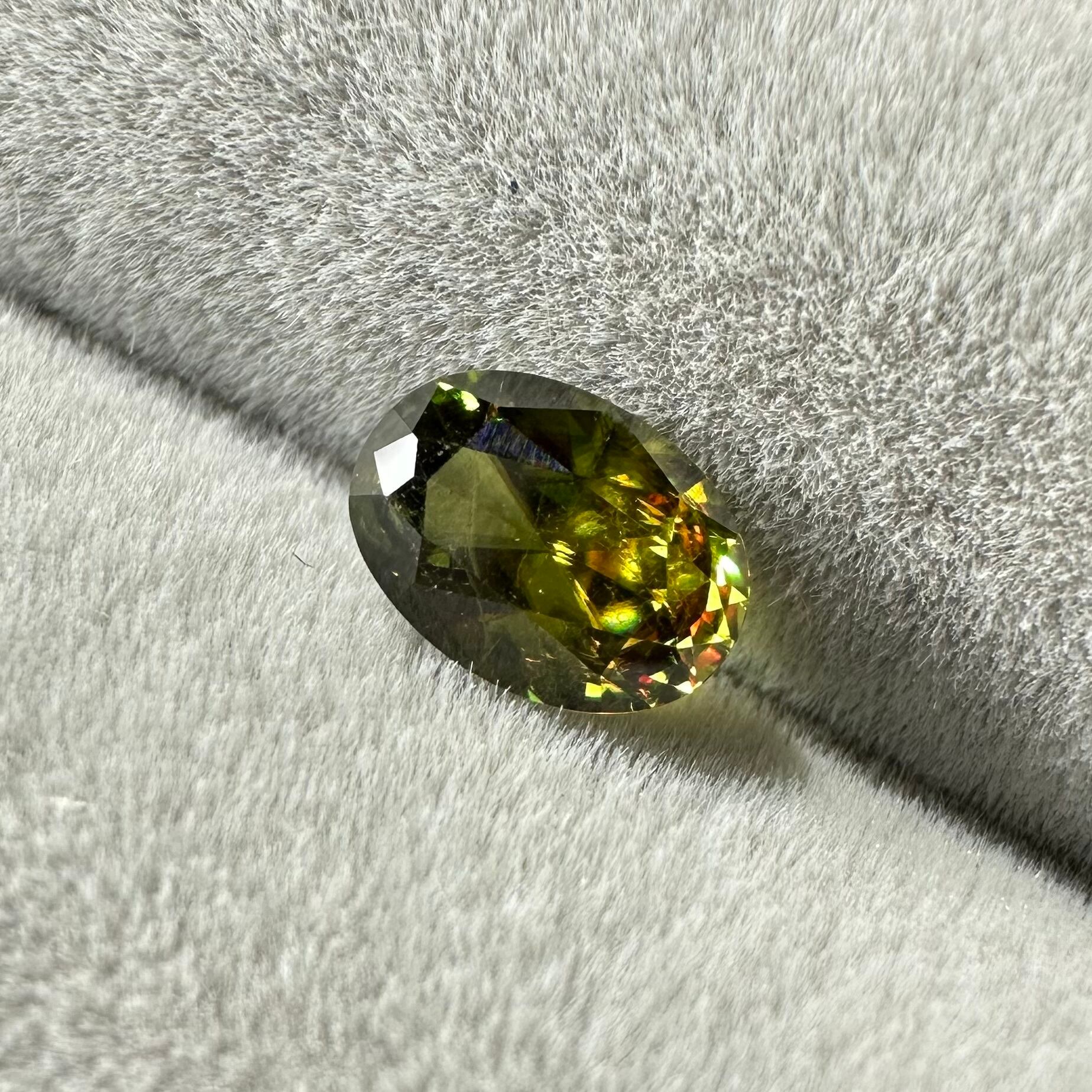光をスペクトル色にする特徴があり、グリーンの宝石ながら、赤、橙、黄、明るいグリーンと様々な色の輝きを見せます。これはダイヤモンドも持つ「ファイア」という特性なのですが、その屈折率はダイヤモンドをも凌ぎます。