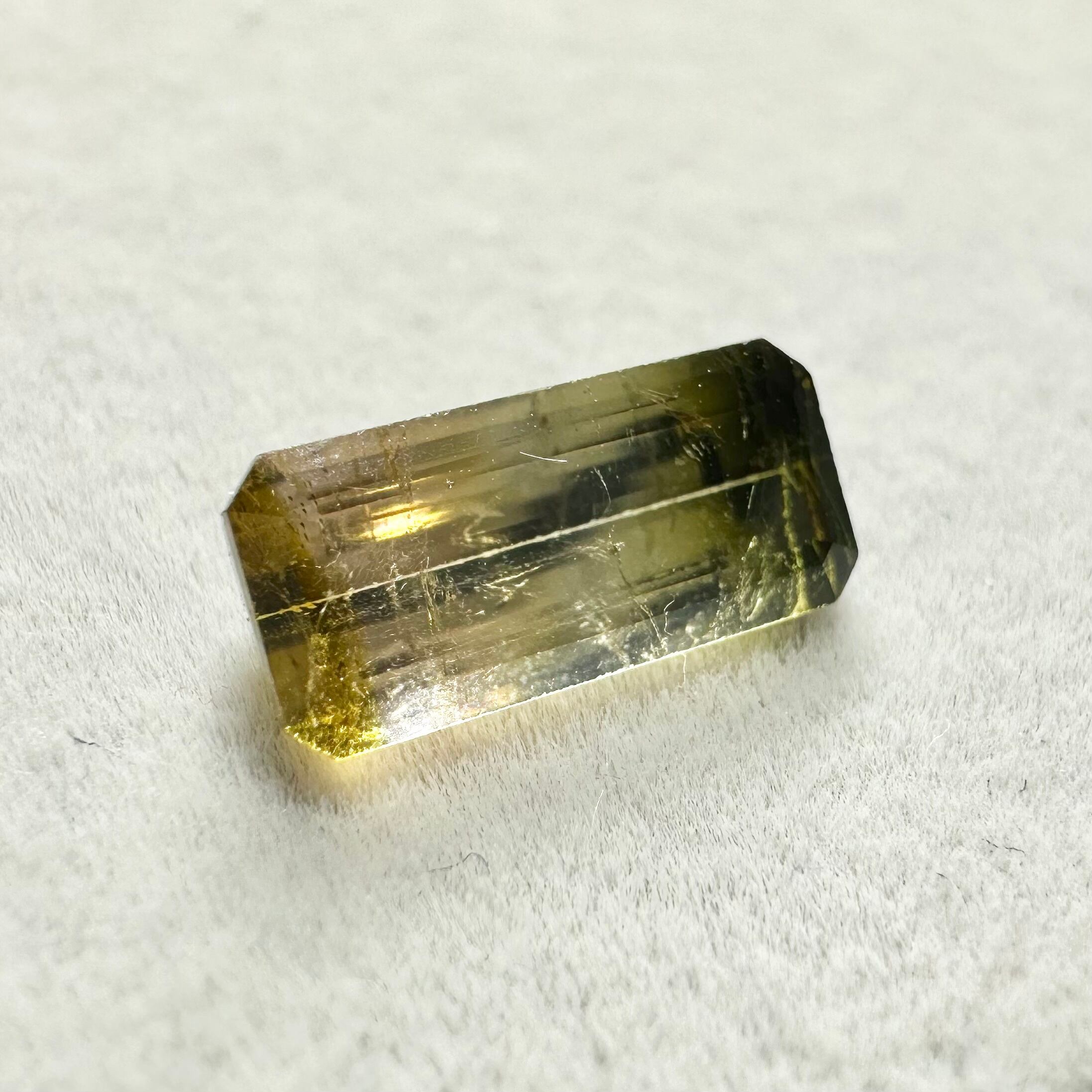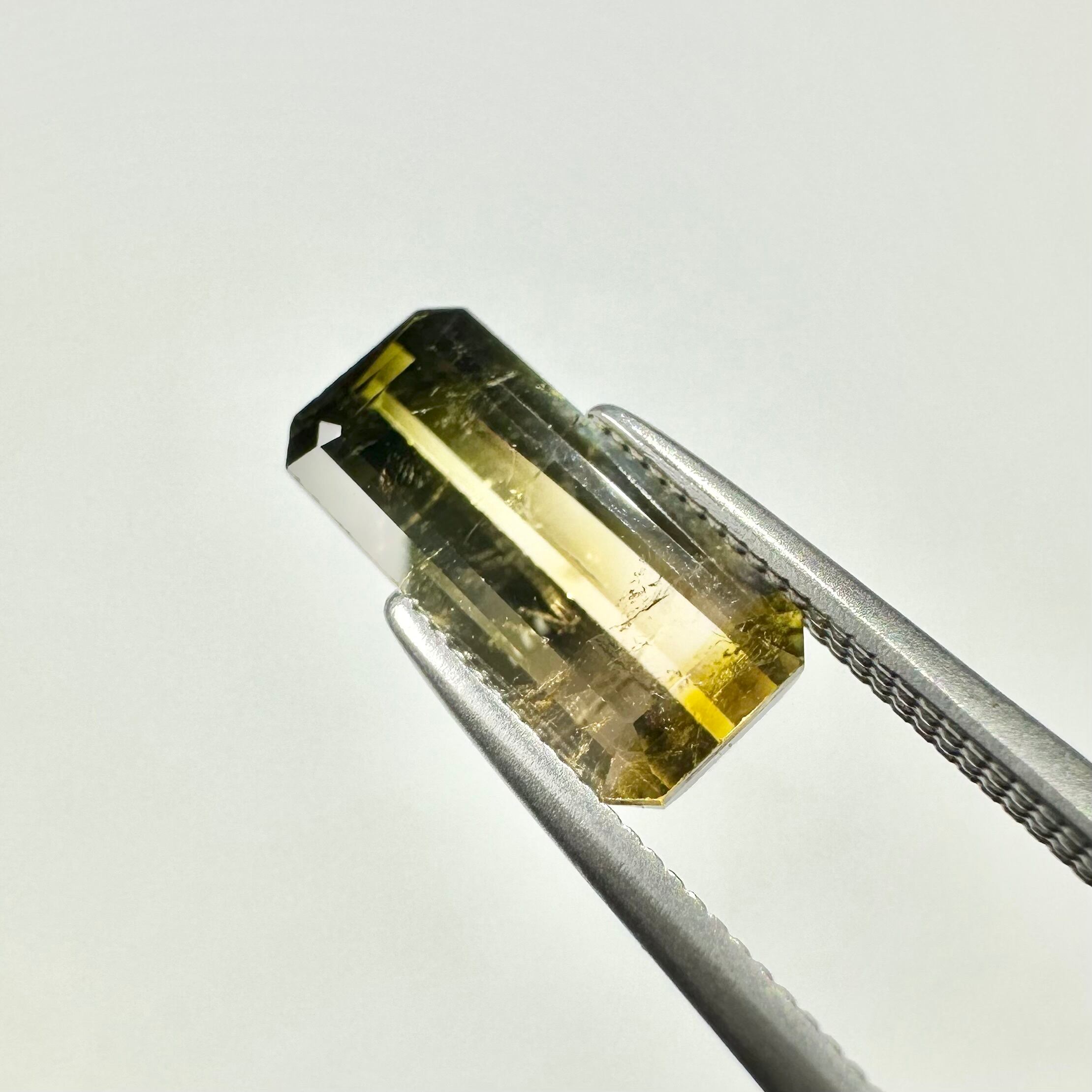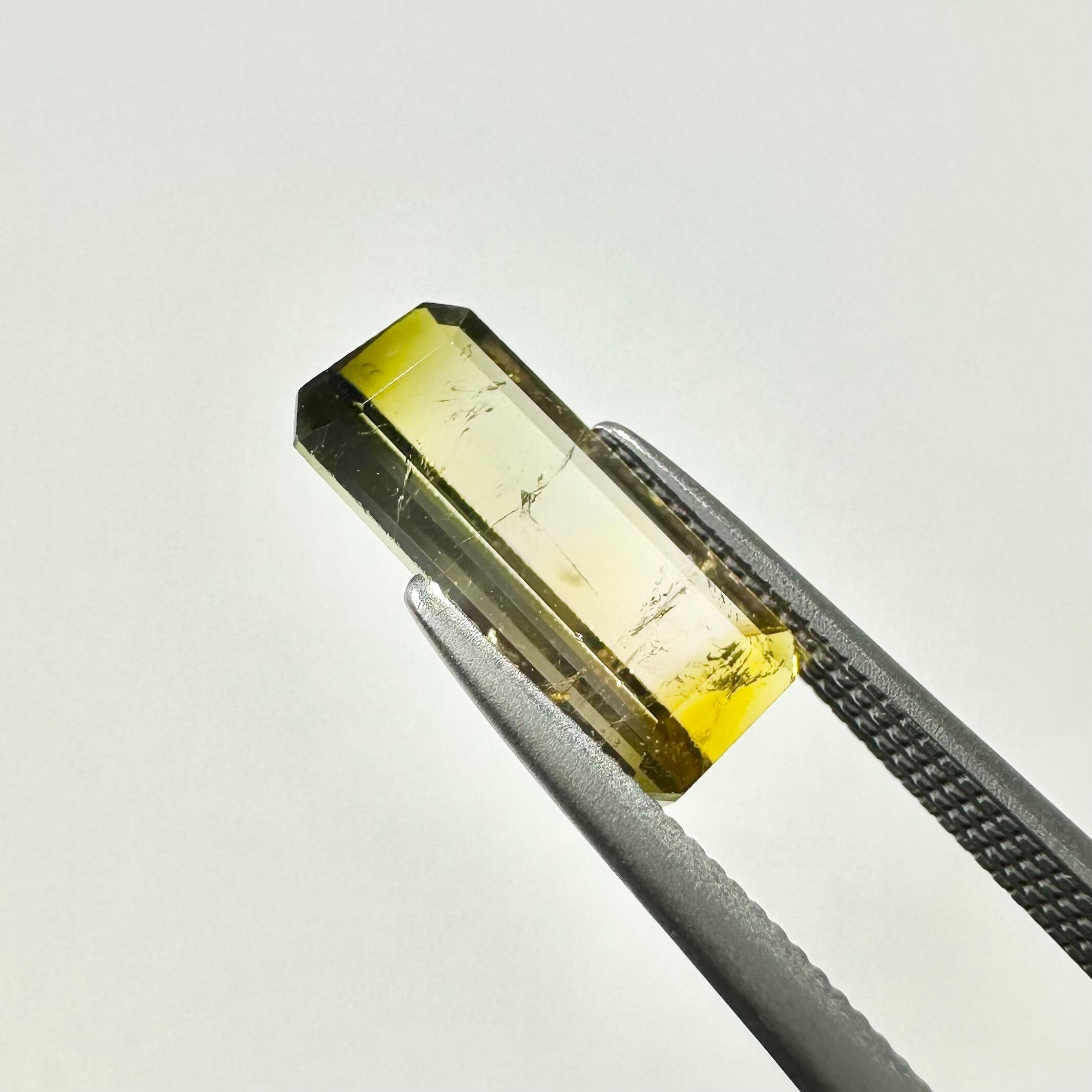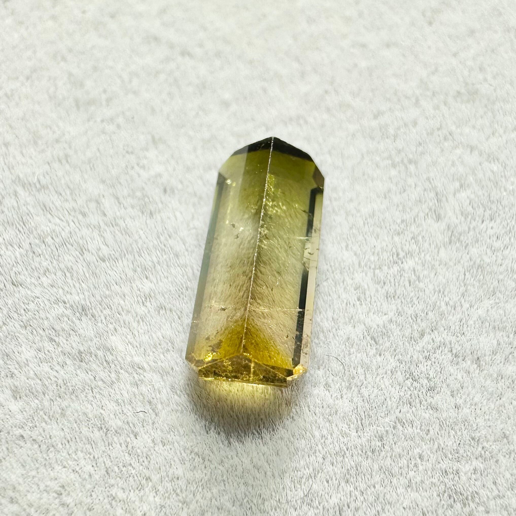 深いグリーンからイエローのバイカラー(というかグラデーションカラーにも見える)トルマリンです。落ち着いた色合いの子です。